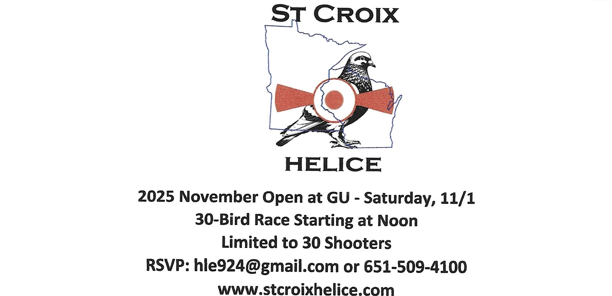 St Croix Helice Announces Final 30-Bird Race of the 2025 Season, on Saturday November 1. See details below. As always, many fun side games to play.