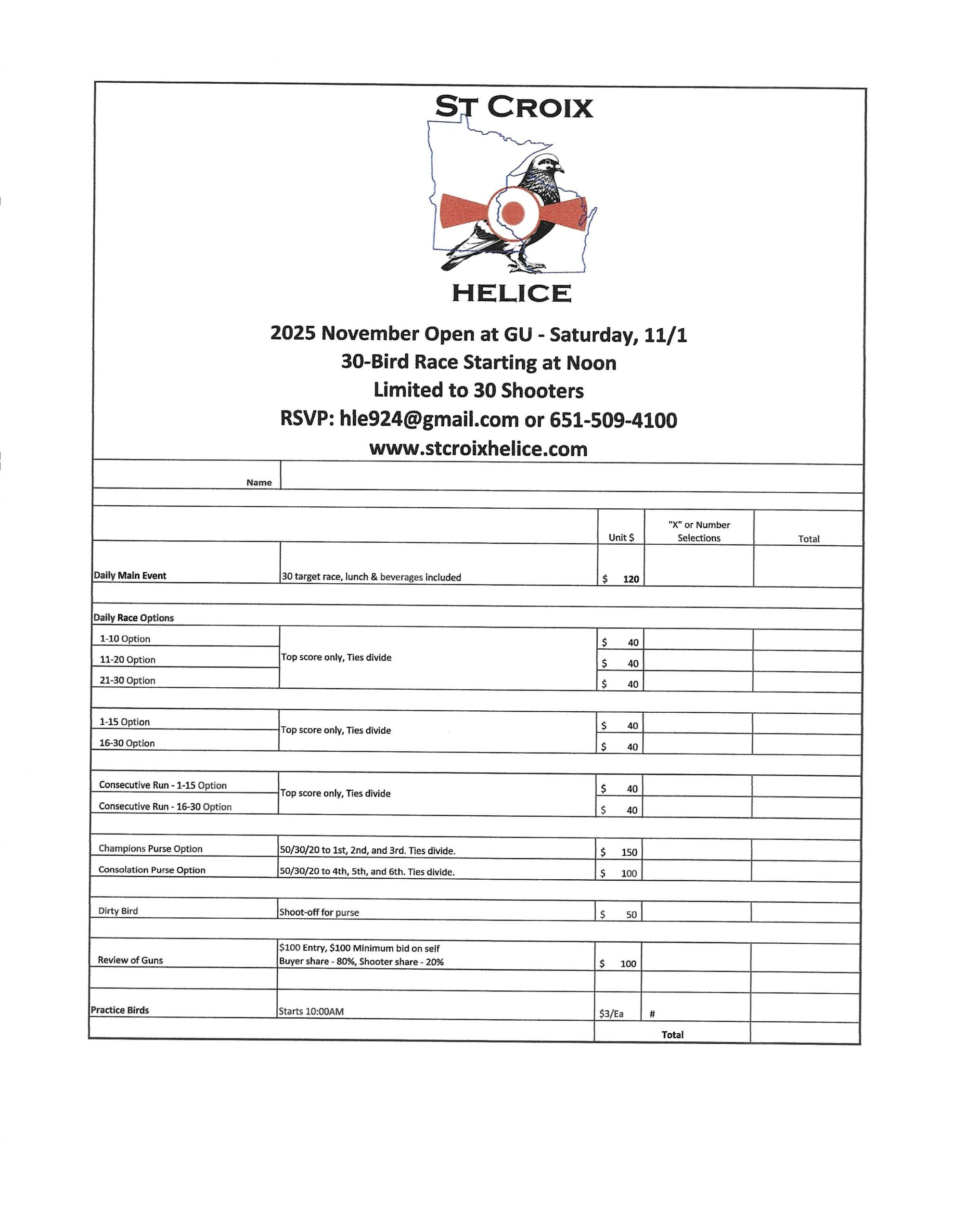 St Croix Helice Announces Final 30-Bird Race of the 2025 Season, on Saturday November 1. See details below. As always, many fun side games to play.